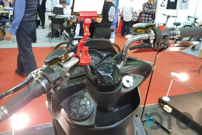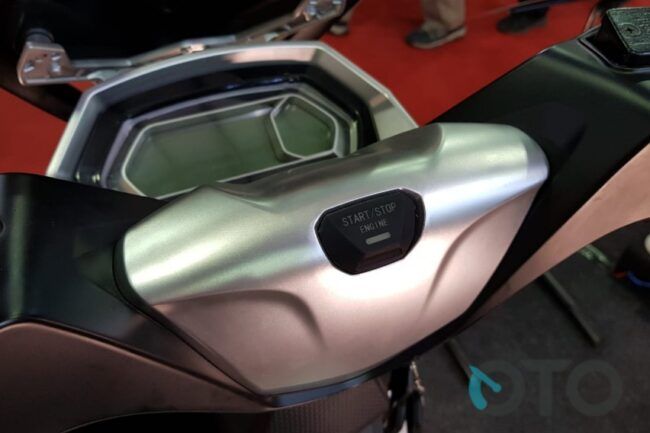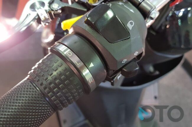 Bagian stangnya sama seperti skutik pada umumnya. Sisi kiri terdapat tombol sein, klakson, pengaturan lampu jauh dekat dan lampu dim. Kanan ada hazard, on/off lampu utama dan tombol mode pengaturan. Uniknya, ada tombol di tengah stang untuk menyalakan dan mematikan motor. Karena motor ini belum ditanamkan baterai, kami belum bisa melihat instumen di dasbor. Di bawah stang ada ruang penyimpanan yang cukup untuk menaruh barang dengan dimensi kecil. Botol atau sarung tangan, misalnya.