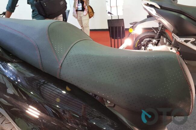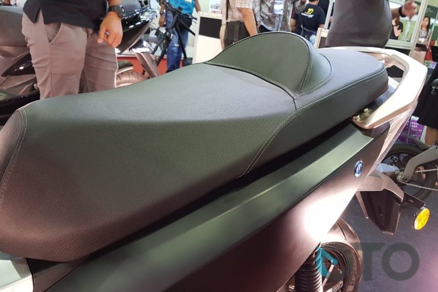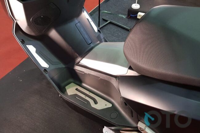 Dek kaki dibuat terpisah antara kiri dan kanan. Itu karena di tengahnya tersedia ruang untuk menyimpan baterai. Soket colokan pengisian baterainya ada di dek kaki sebelah kiri. Layaknya skutik konvensional berbodi gambot, kaki bisa diajak selonjoran. Joknya empuk dan ada sedikit sandaran di bagian tengahnya. Tapi jadi memakan tempat duduk untuk pembonceng.