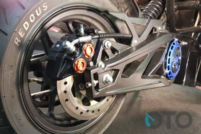 Tenaga penggerak pakai baterai jenis Lithium 72V45Ah. Maksimum speed sampai 100 km/jam dan bisa menempuh jarak 100 km dalam keadaan baterai terisi penuh. Lagi-lagi kami tidak bisa mendapatkan informasi lebih mengenai spesifikasi tenaganya.