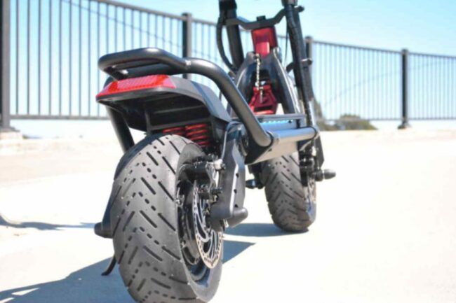 Sayang, saat kami berbincang, unitnya tak dipajang. Namun mengacu pada laman resmi Kaabo, paling menarik memang Wolf Warrior, tipe paling tinggi. Bekalan baterai besar jadi kunci ia bisa melesat cepat. Tepat di balik papan pijakan, menempel dua aki berdaya 60 V 26 Ah. Motor listrik yang terpasang di masing-masing roda, juga memiliki kekuatan 1200 W. Mudah memberi torsi instan dan memacunya hingga 90 kpj, mengingat bobotnya cuma 46 kg.