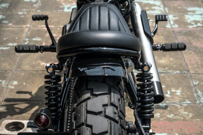 Bagian belakang menggunakan fender yang sudah dimodifikasi, lebih pendek dari versi aslinya. Stoplamp mengendalkan part aftermarket yang dipasang di sisi kiri, tepat di belakang shock. Seinnya ada di ujung atas suspensi. Pelek tidak berubah, masih bertahan dengan desain palang 10. Ban juga tetap mengandalkan pola blok dengan ukuran 120 depan dan 130 belakang. Rem cakram depan dan belakang juga tetap sama.