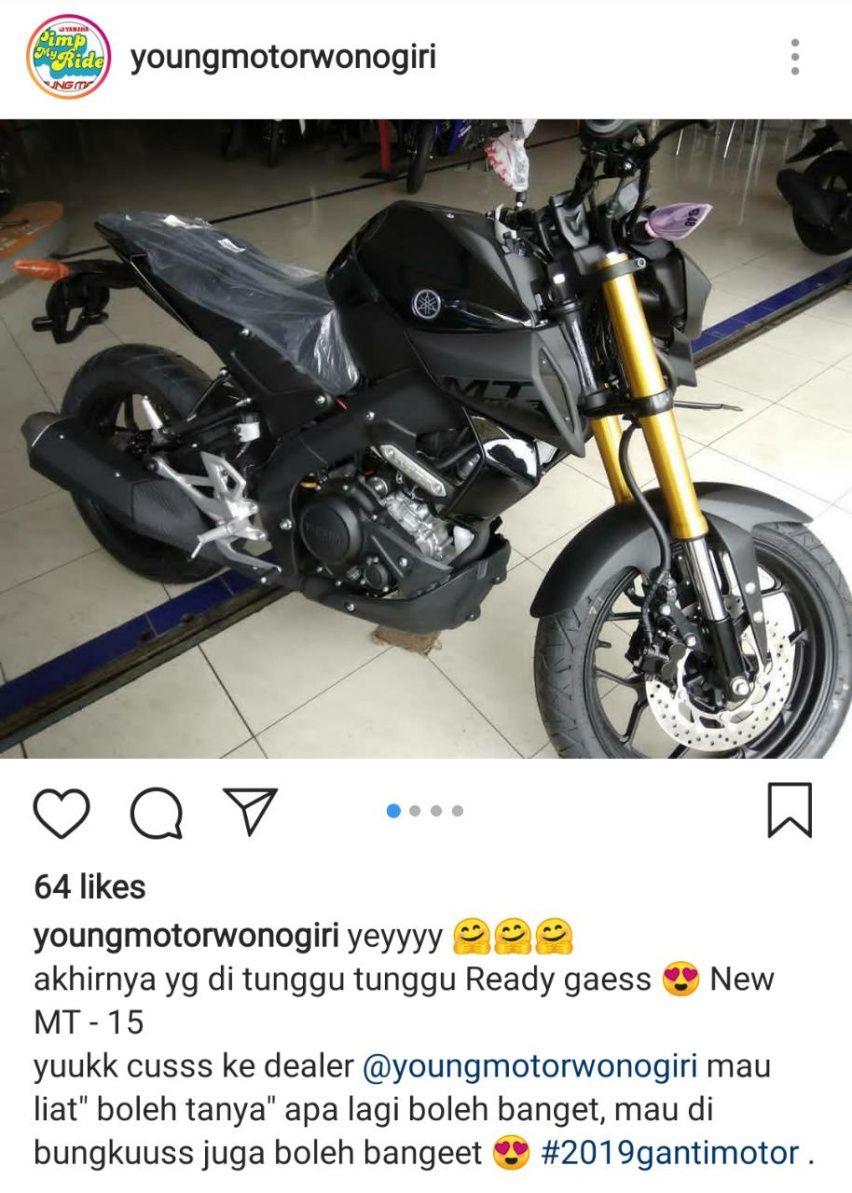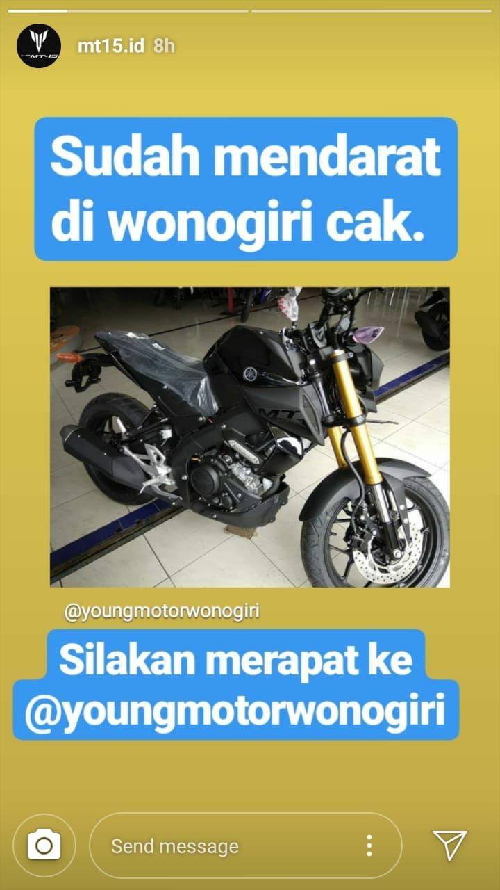 “Yeyy, akhirnya yang ditunggu-tunggu ready guys. New MT-15, yuk cuss ke dealer Young Motor Wonogiri,” tulis akun itu dalam unggahannya beberapa jam lalu (16/1). Publikasi ini tentu menjadi angin segar bagi Anda yang sudah menunggu hadirnya naked bike bergaya supermoto ini.