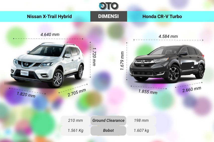 Sekilas dilihat dari luar, CR-V agak sedikit lebih panjang dibanding X-Trail. Ternyata dari spesifikasi resmi, X-Trail justru lebih panjang 56 mm. Mengejutkan, karena CR-V mampu menampung 7-penumpang sedang X-Trail Hybrid hanya 5-penumpang. Proporsi ini didapat lantaran X-Trail memiliki jarak sumbu roda yang lebih panjang 45 mm, sehingga membuat moncongnya terlihat lebih pendek.