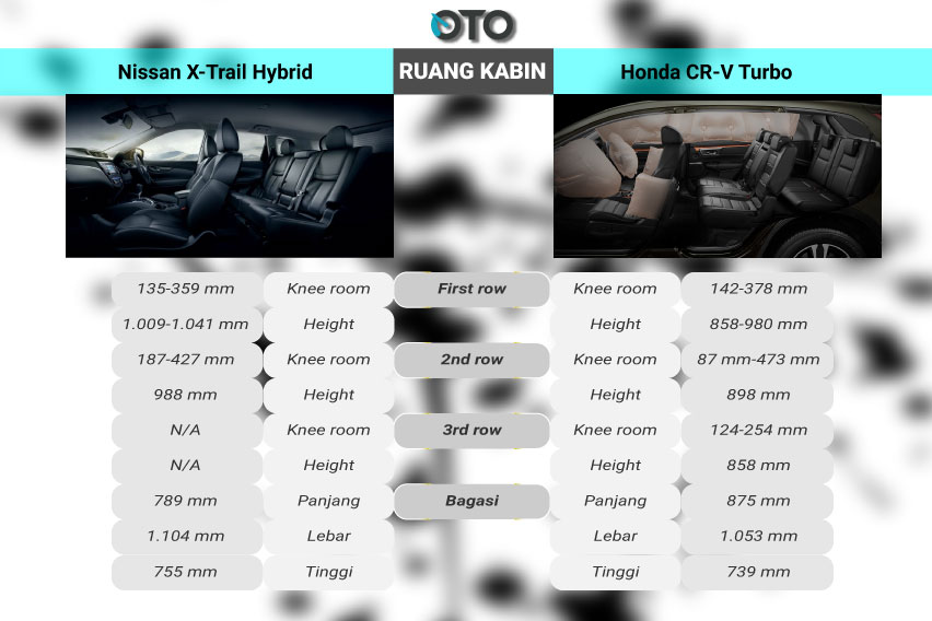 Nissan X-Trail Hybrid hanya berkonfigurasi 5-seaterIntinya, walau menawarkan ruang kabin yang tak seluas CR-V, bukan berarti kabin X-Trail sempit. Justru kabin X-Trail sangat luas. Terutama untuk ruang kepala yang lebih baik dari CR-V. Ini karena X-Trail memiliki dimensi yang lebih tinggi 41 mm dari CR-V.