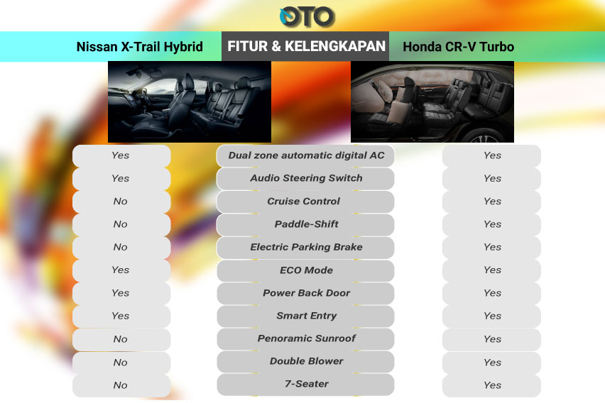 Mendengar kata hybrid, tentu kita membayangkan X-Trail memakai teknologi masa depan yang maju. Bukan hanya untuk sistem penggeraknya saja, tapi juga fitur di bagian dalam kabinnya. Namun ternyata tidak demikian. Honda CR-V bermesin turbo yang dijual lebih murah, justru punya fitur lebih lengkap.