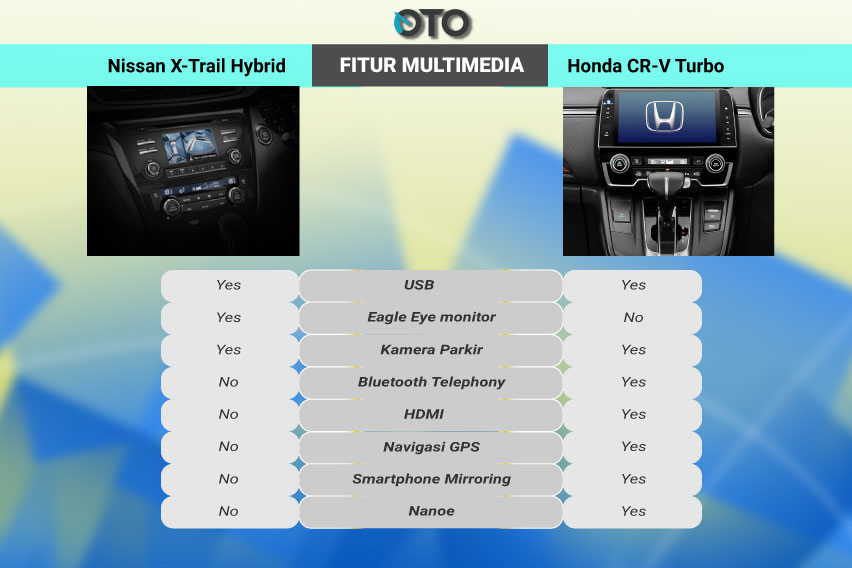 Konsumen semakin berpihak kepada CR-V kalau tahu sistem multimedia yang dimilikinya. Head unit layar sentuh berukuran besar SUV paling laris Honda di dunia ini, bisa menampilkan navigasi satelit (GPS), mirroring dengan smartphone secara lewat koneksi HDMI juga koneksi bluetooth untuk menerima panggilan telepon. Semua ini tak tersedia pada head unit X-Trail.