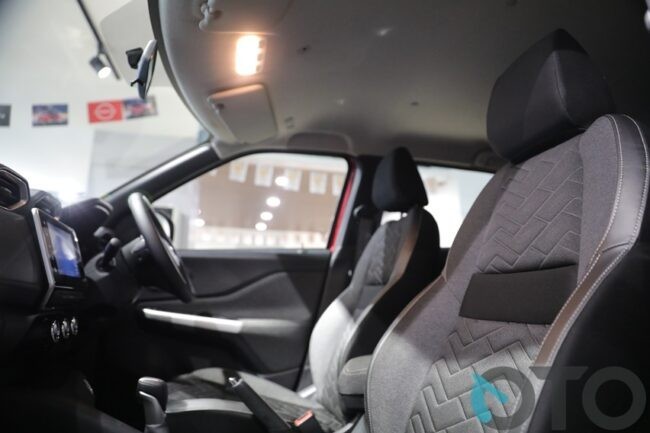 Nyaris dipandang murahan, beruntung Nissan pandai mendongkrak nuansa kabin. Bumbunya berupa komplementer material pembungkus fabric di jok, armrest, dan door trim. Bukan sekadar sehelai kain tipis pula, bertekstur tangguh bak kain jin. Pun tidak disulam polosan, ada tonjolan-tonjolan membentuk motif yang sedap dipandang tanpa membuatnya terlalu berlebihan. Di samping itu, lingkar kemudi sudah dibungkus leather. Satu penunjang visual lain dapat dilihat pada muka dasbor lewat panel halus bermotif.