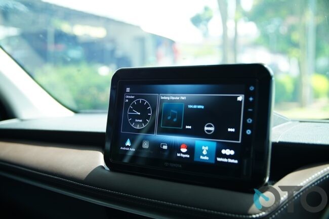 Peningkatan signifikan terjadi pada head unit berukuran 9 inci dengan gaya floating. Detail gambar dan warnanya tidak mengecewakan, respons sentuhannya pun terbilang cepat. Ia bisa dikoneksikan ke smartphone. Sekaligus menjadi jembatan bagi aplikasi In-Touch yang kini terus digalakkan Toyota. Sebuah software yang mengizinkan pengguna memantau kendaraan lewat ponsel pintarnya. Fiturnya beragam mulai dari mencari mobil, geofencing, update trip sama permintaan bantuan. Di bawah head unit terdapat kontrol AC yang dipenuhi kenop putar dan tombol dengan panel digital.