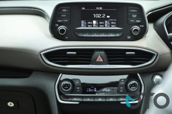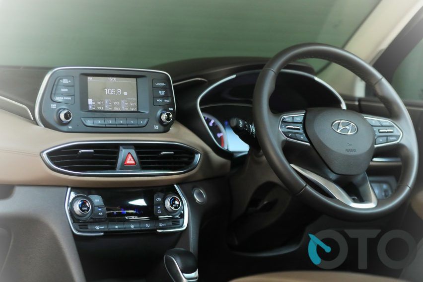 Kabin Santa Fe tidak terlalu menebar kemewahan. Cukup dengan balutan kulit di sekujur jok, setir, dasbor sampai konsol tengah. Material digunakan juga berkualitas tanpa perlu banyak dihiasi panel kayu. Hyundai cenderung memberi kesan sporty dari banyak elemen silver melingkar di berbagai panel.