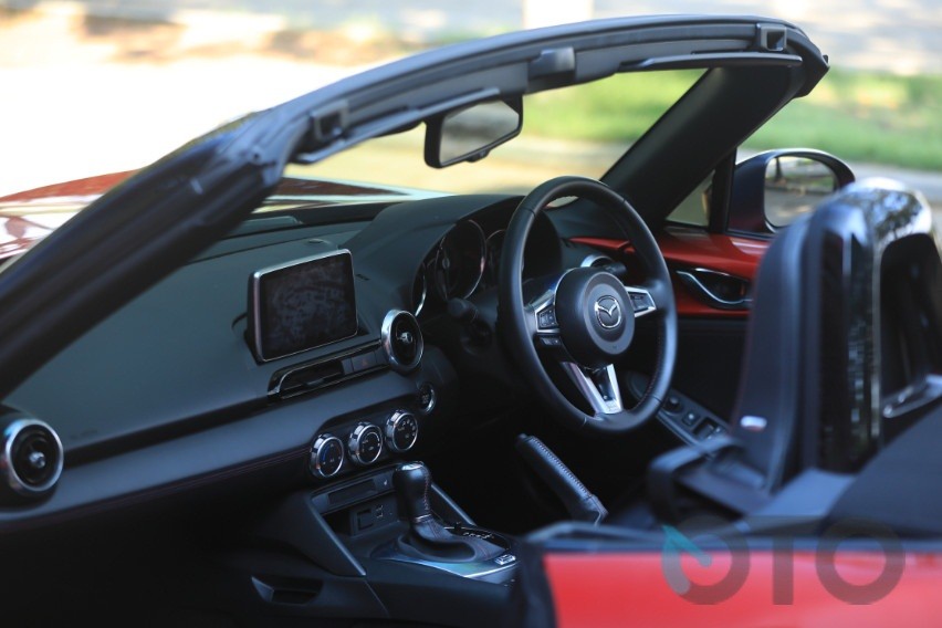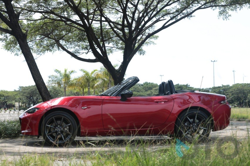 Prinsip atap terbuka memang jadi ciri khas utama MX-5. Varian yang kami uji tipe Soft Top dengan atap kanvas. Sayangnya, tipe yang dijual adalah RF (retractable fastback). Kami sebut sayangnya, sebab, tipe soft top lebih menjanjikan keasyikan mengendarai sebuah roadster. Ketika atapnya dibuka, tak ada batas antara Anda dan lingkungan luar. Visibilitas jadi sangat luas. Sensasi berbeda ditawarkan oleh model RF. Terdapat struktur pilar B yang menghalangi pandangan walau atap dibuka.