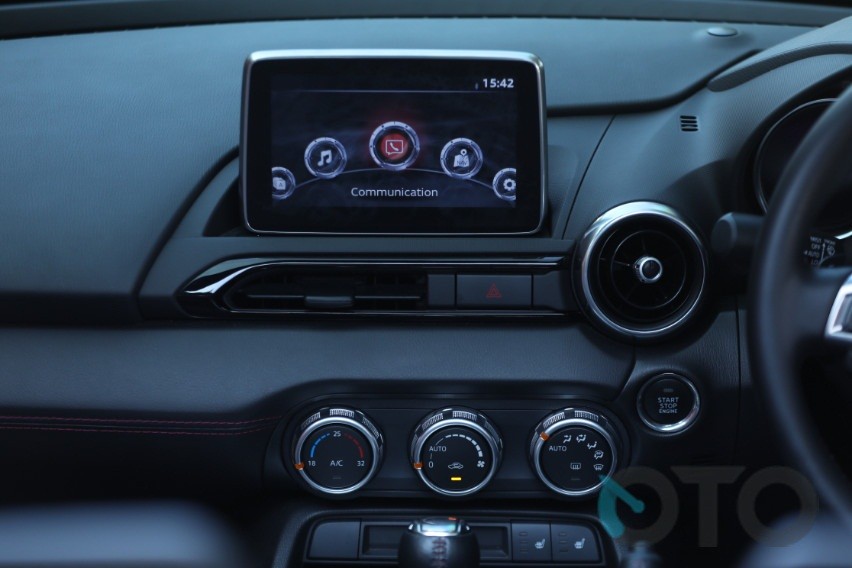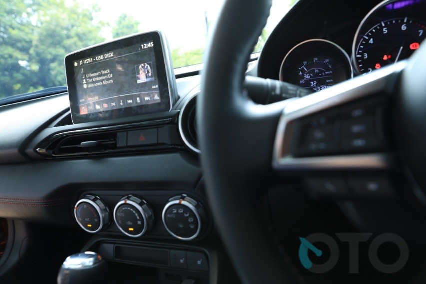 Fiturnya sama saja dengan semua model Mazda yang ada di Indonesia. Bahkan dibanding model yang beredar di pasar internasional, kami tak melihat adanya pemangkasan fitur berarti pada Miata anyar. Sistem entertainment yang terintegrasi dengan kontrol mobil sudah digunakan. Layar touchscreen bisa dijadikan visualisasi hiburan maupun informasi mobil. Kontrolnya bisa dengan menyentuh layar, tombol putar di konsol tengah, maupun voice command.