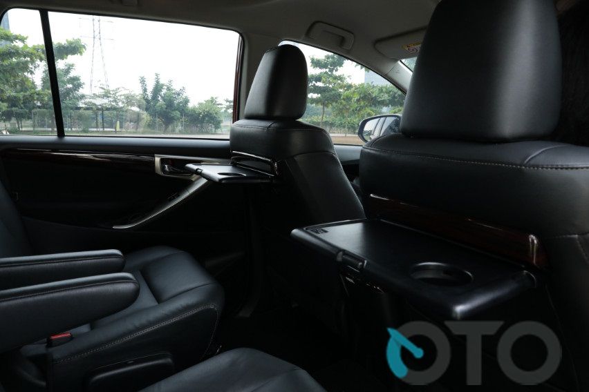 Kepraktisannya tentu khas Innova termahal. Ada bottle holder, cup holder, laci, penyimpanan dan meja lipat kabin belakang. Baris kedua dengan captain seat yang lebih mewah, nyaman dan personal. Jadi terasa harga mahal yang harus Anda bayar. Apalagi ditambah meja lipat itu tadi. Sedang baris ketiga bisa diokupasi tiga orang, headrest tengahnya bisa dipasang jika dibutuhkan. Melipat kursi baris ketiga untuk bagasi penyimpanan lebih banyak juga mudah.