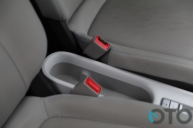 Sayang tak ada komponen armrest di sektor tengah, driver dan penumpang depan hanya bisa menyangga area tangan pada armrest di bagian pintu saja. Adapun untuk kursi menggunakan bahan kulit yang sudah mendukung pengaturan reclining serta maju mundur.