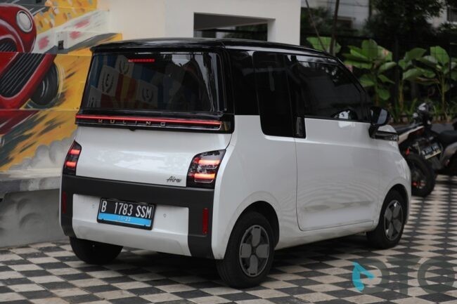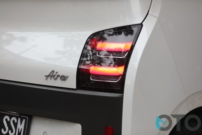 Bagian sampingnya tampil minimalis, berkat penggunaan jumlah pintu yang hanya 2 buah. Tak ada banyak aksen agresif, selaras dengan desain mungil yang diusung dari Air ev. Dimensi bodi yang kompak juga terlihat dari pengaplikasian pelek 12 inci berbalut ban 145/70 rata depan belakang.