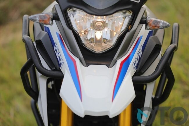 Secara dimensi memang jauh dibanding R 1200 GS, tapi GS kecil ini tetap berikan kesan perkasa. Tampilan tinggi dan lebar cukup mengagumkan. Bagian depan gunakan lampu depan yang sama dengan saudaranya bertipe naked bike, tetapi wajahnya sangat berbeda. Itu berkat paruh gaya ADV yang besar dan kaca depan kecil di atasnya. Windshield ini terlihat pas dan berfungsi dengan baik. Berikan beberapa tingkat perlindungan angin dan memungkinkan banyak udara menyegarkan ke dada dan helm.