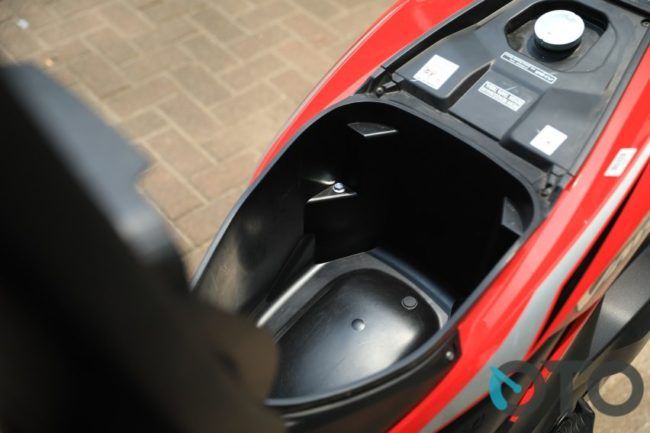 Awalnya, ini dilakukan demi menyediakan kantung penyimpanan yang besar di bagian depan. Ternyata kantung penyimpanan di bawah stang tak sebesar yang kami duga. Selain ruang yang kecil, mulutnya tak begitu besar dan dibiarkan terbuka begitu saja tanpa penutup. Untungnya, kompartemen di depan masih cukup untuk botol minum berukuran menengah di sebelah kiri dan nota parkir ataupun koin logam di sebelah kanan.