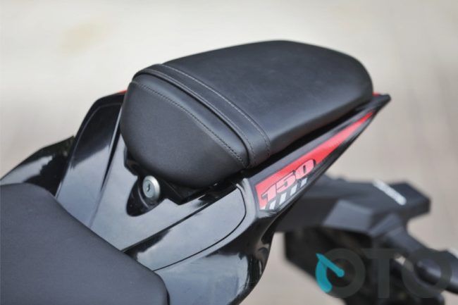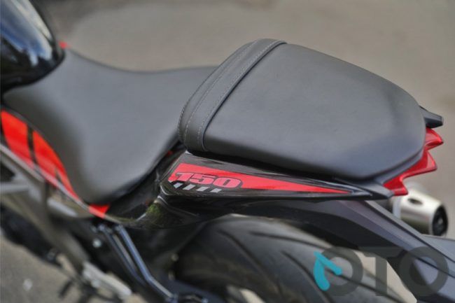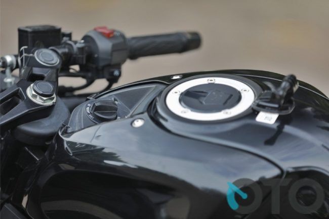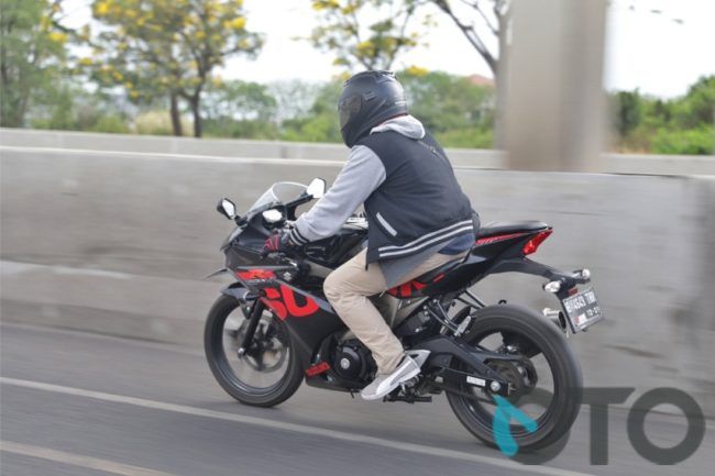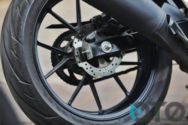 Desainnya yang minimalis, didukung ban yang ukurannya tak terlalu besar. Ban depan menggunakan ukuran 90/80 dan 130/70 pada ban belakang. Keduanya membalut pelek 17-inci. Ukuran bannya ini lebih kecil dari kedua kompetitornya. Ditambah lagi tinggi tempat duduk dari permukaan jalan yang 785 mm ini, lebih pendek dari Honda CBR150R (787 mm) dan Yamaha R15 (815 mm). Walhasil, untuk saya yang punya tinggi badan sekitar 170 cm, tak kesusahan menapakkan kedua kaki ke jalan saat duduk di atas jok motor.