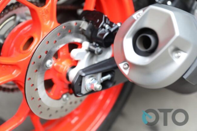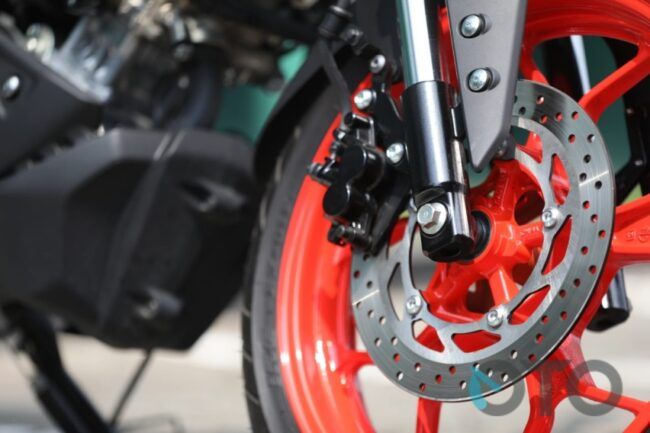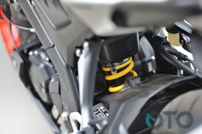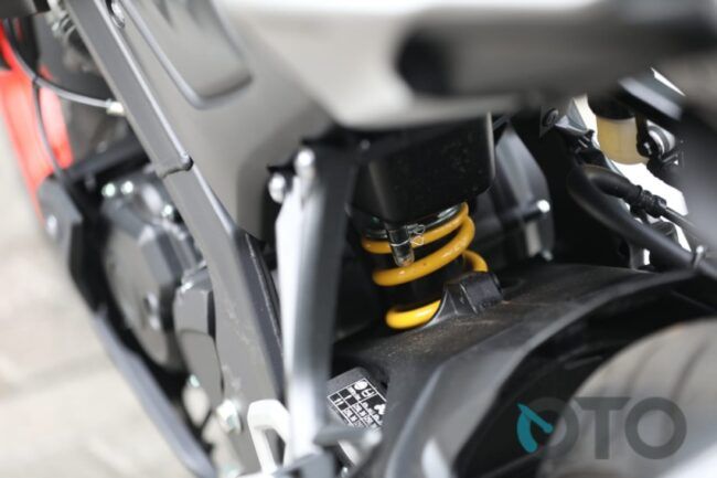 Nilai utama dari tampilan motor, ada suspensi up side down berkelir emas. Diameternya yang besar, benar-benar tidak umum untuk ukuran motor 150 cc. Perlu diingat, tak ada setelan suspensi semacam preload. Tapi itu bukan masalah, yang penting motor tampak gagah jika kita lihat dari depan.
