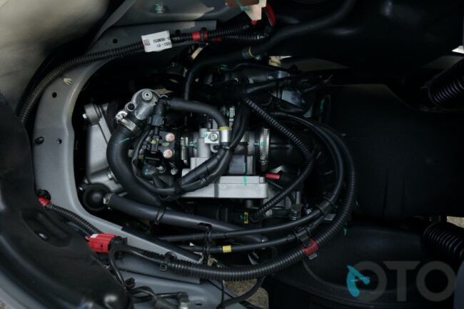 Hasilnya? Torsi naik 18 persen dan tenaga sekitar 12 persen. Dalam hitung-hitungan matematis, dapur pacu 278,3cc empat katupnya membuahkan tenaga 23,4 hp/8.250 rpm. Torsi juga ikut terelevasi, menjadi 26 Nm/5.250 rpm. Angka yang besar buat sebuah skuter macam ini.